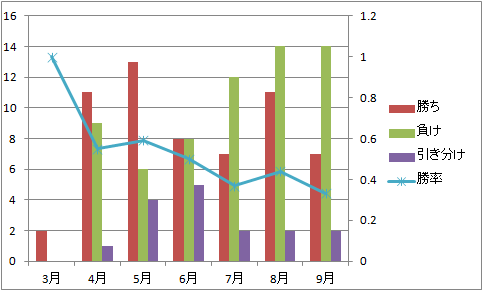 | 勝率 | 1 | 0.550 | 0.591 | 0.5 | 0.368 | 0.440 | 0.333 |